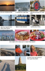 Less than a mile inside the mouth of the Cape Fear River – we discovered a tiny marina / golf complex tucked behind a narrow channel to our starboard side. It was 5PM, and most marinas are closing – but we got lucky. They had a slip for us for the night. Paddy motored into the Bald Head Island Marina – and we sidled up to the face dock for the night for $20 – an unheard of rate. Then, we received a $20 coupon for dinner. Do the math. Dockage plus dinner for about $20. Nice. If you have to enter the Cape Fear River – Bald Head Island is a great place to stop. Plus, there are no cars here.