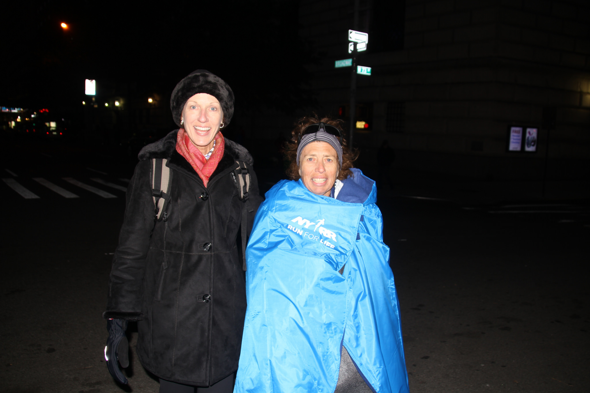 I finally see that Fluffy Russian Hat again with the frantic waving arms. Jill of Team Sherpa has been spotted. I do my best job of sending running instructions to my legs – but mechanical failure has set in. I have become a running-zombie and my legs are just “goofy” at this point. I’m all smiles for my Sherpa Team — they have completed their own marathon of sorts keeping track of Emma (aka Minnie Mouse) and myself, trying to navigate a subway system that is jammed with other runner’s Sherpas, trying to cross streets that are blocked by an endless barrage of 50,000+ runners, to see their runner for 5-10 seconds, and then move to the next rendezvous point. I willed my legs to head toward my Team Sherpa – and handed off some extra clothing that I no longer needed.