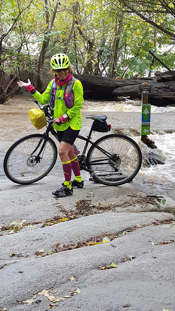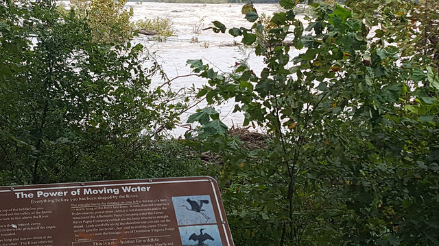 Once in Belle Isle, my heart rate returned to normal, and we spent much time taking in the historic Civil War landmarks, and meandering along trails devoid of vehicle traffic. ECG signs allowed us to navigate without having to stare at our GPS equipment. It was a good thing that Donna, who had taken the lead, was paying attention the the pathway ahead, because she suddenly stopped. I hit my brakes – partially because I had zoned out – and we discovered that our trail had become one with the James River.