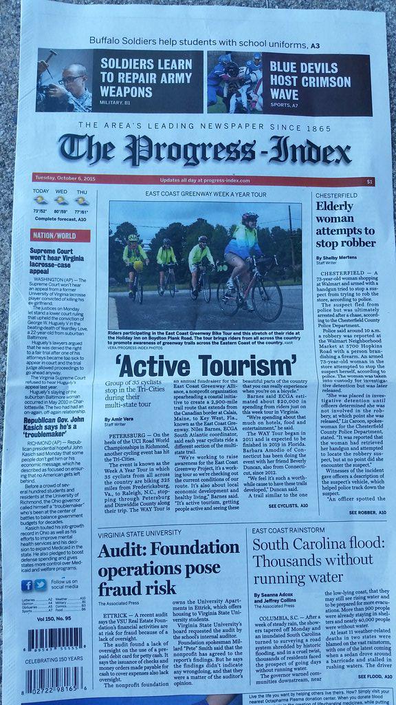 Day 3: Our East Coast Greenway WAY bicycle tour made the upper fold of the local newspaper!