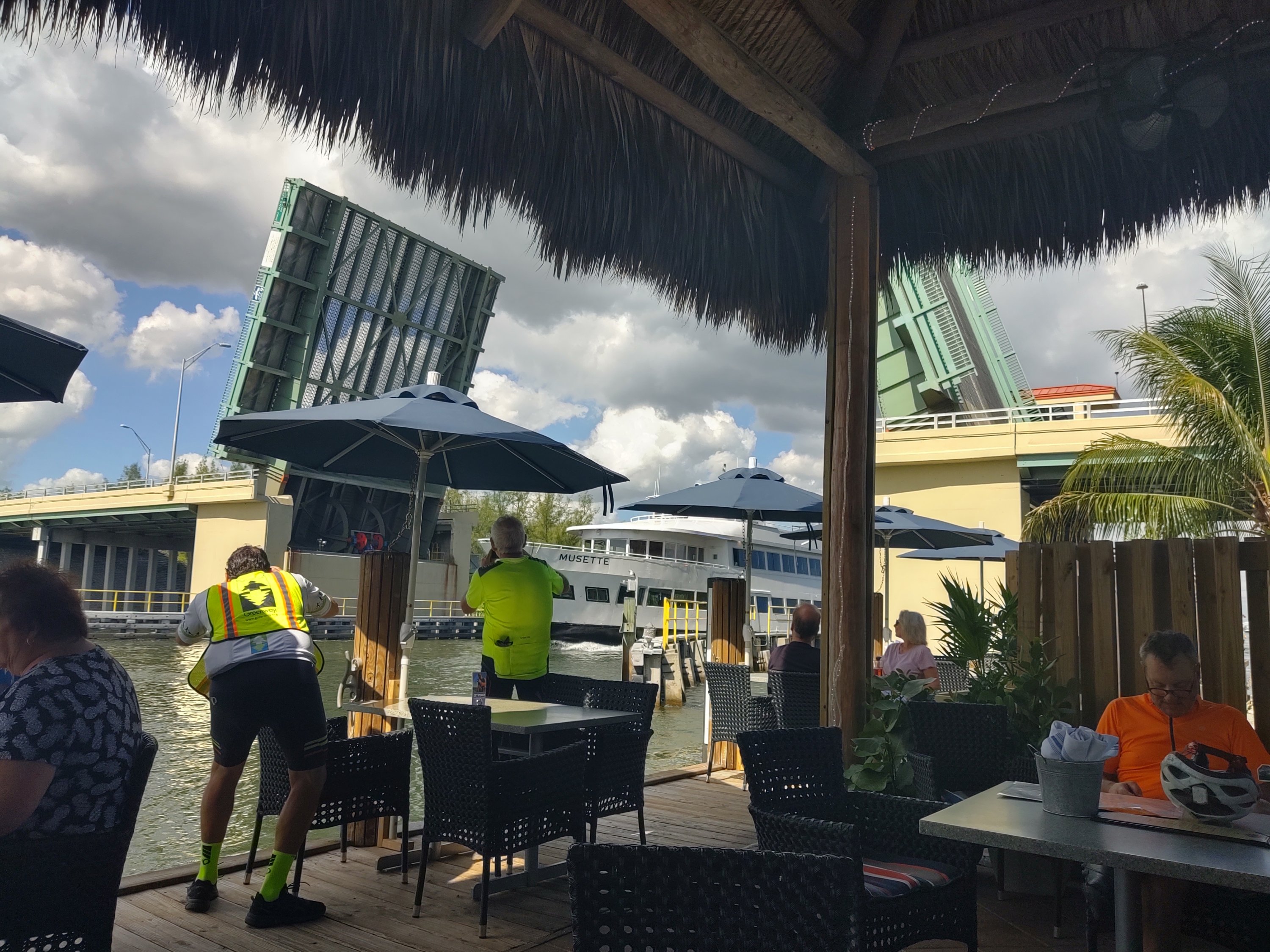 The next 11 miles in and around Fort Lauderdale had bike lanes, until it didn’t, had shoulders until they were blocked by construction vehicles and had drivers who were late for their business meetings. We rode in small groups and stayed tight together until we parted ways with the Fort L and arrived at Jimbo’s Sand Bar on Dania Beach. Located along the ICW, the vibe was relaxed and welcoming and we sat outside watching the fierce water currents and boats passing through. No one really wanted to leave, but we had another 18 miles to go to reach Miami Beach.